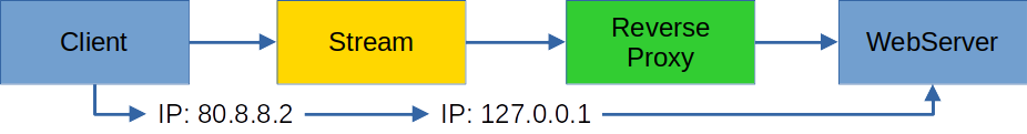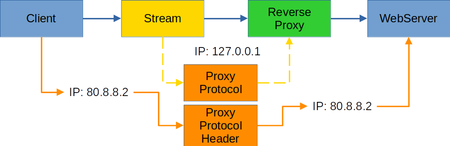 As can be seen in the diagram, the stream still receives the original IP from the querying <mark style="background-color:blue;">client</mark>. As soon as the <mark style="background-color:yellow;">stream</mark> connects to the <mark style="background-color:green;">reverse proxy</mark>, this is an internal connection with 127.0.0.1. The information is lost from the reverse proxy for the <mark style="background-color:blue;">web server</mark>.